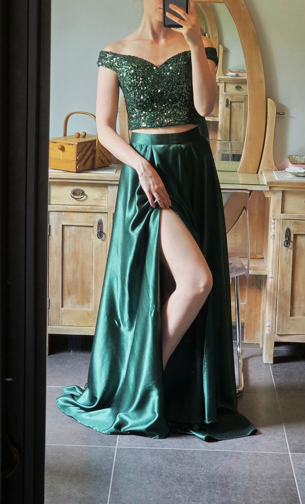 rok, top, juwelen, schoenen